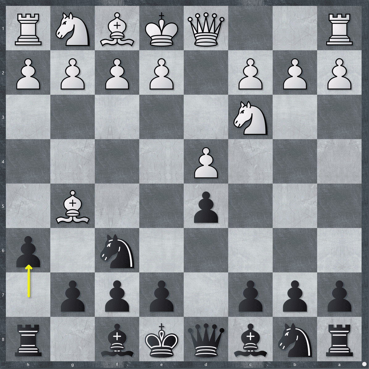 Chapter 8: KID Main Line: Classical (e4 setup): 1.d4 Nf6 2.c4 d6 3.Nf3 Nbd7 4.Nc3 e5 5.e4 The second top line, and the heart of the course. Black plays the clever …h6 move order, waiting for White to commit with dxe5 and Qc2 before castling. This avoids the dangerous Kh1-Rg1 plans that make the normal …O-O move order risky at the top level. The course explains the full plan: …O-O, …Re8, …Nc5, …Nh5-f4, …g5, and the kingside avalanche that follows.